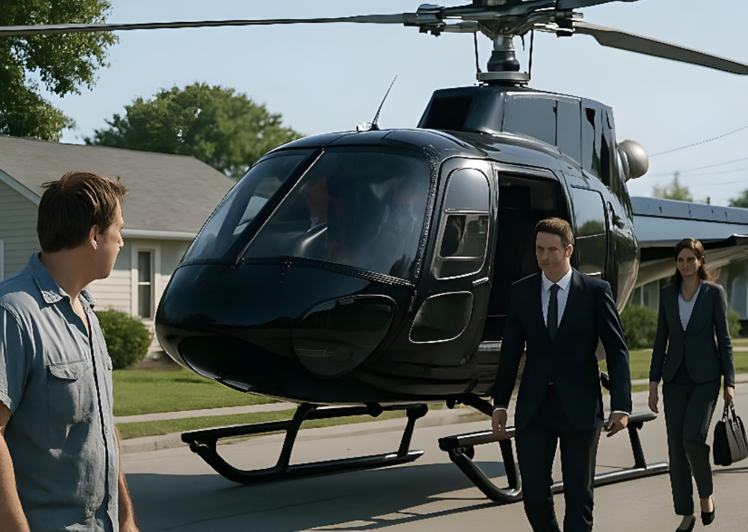 Giunto davanti alla sua casa, una scena incredibile lo attendeva: un grande elicottero era parcheggiato al centro della strada, circondato da uomini in giacca e cravatta, come se lo aspettassero da tempo.