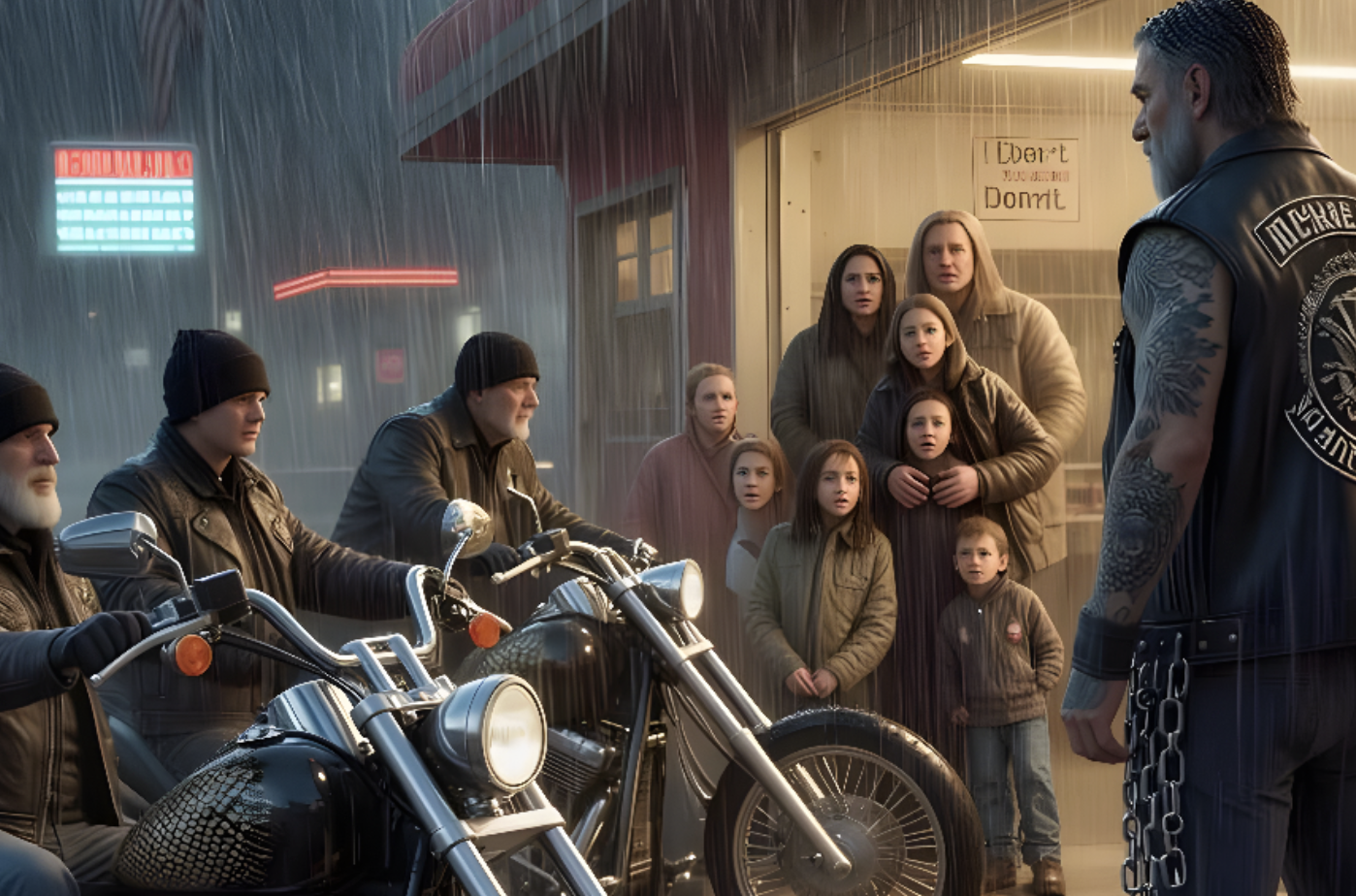 Fuori, la pioggia perforava il parcheggio, disegnando aloni intorno alle lampade a sodio. Tre motociclette sconosciute si fermavano dall’altra parte della strada, motociclisti accasciati, volti nascosti in berrette e fumi.