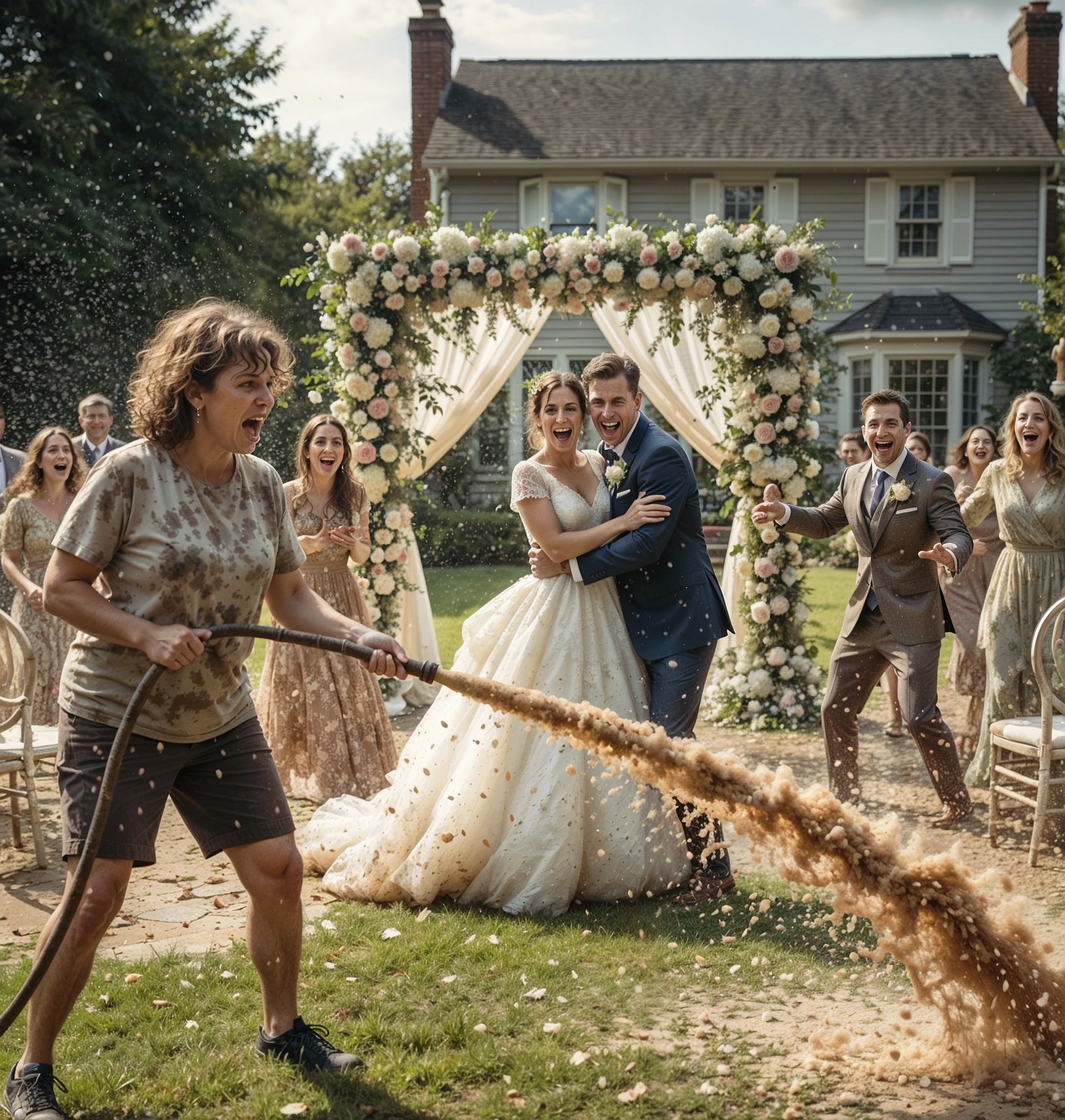Prima un gorgoglio nel terreno, poi un sibilo. E infine l’esplosione: getti scuri, densi, impregnati di anni di ruggine e terra. L’acqua schizzò in archi pesanti colpendo sedie, vestiti, fiori, decorazioni. Le tovaglie si macchiarono in pochi secondi. I bicchieri caddero. Il DJ saltò indietro mentre i suoi altoparlanti si spegnevano in un lampo.