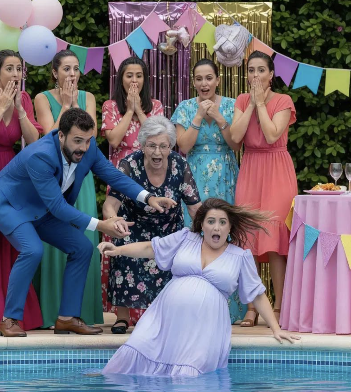 L’impatto con l’acqua fu un momento che non dimenticherò mai. Il mio vestito pesava, il respiro diventava difficile, e l’unica cosa che riuscivo a pensare era proteggere Lucía. Sentivo movimenti strani, un disagio nuovo, mentre cercavo di risalire in superficie. La vista si offuscò e la paura prese il sopravvento.